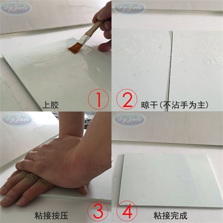 3、黏接無孔材料時,在被黏物表面均勻涂抹PS專用膠黏劑,只需單面上膠無需晾直接把黏結(jié)面對準粘合到一起并壓實1~2小時,24小時后可達到高強度。