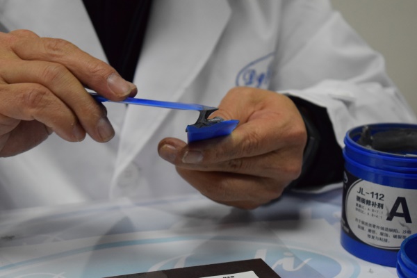 02—【涂膠】 混合后的膠水先后涂布于一個鋁合金屬件接面,再涂布于另一個鋁合金屬件接面,然后進(jìn)行粘合修補(bǔ)膠水。